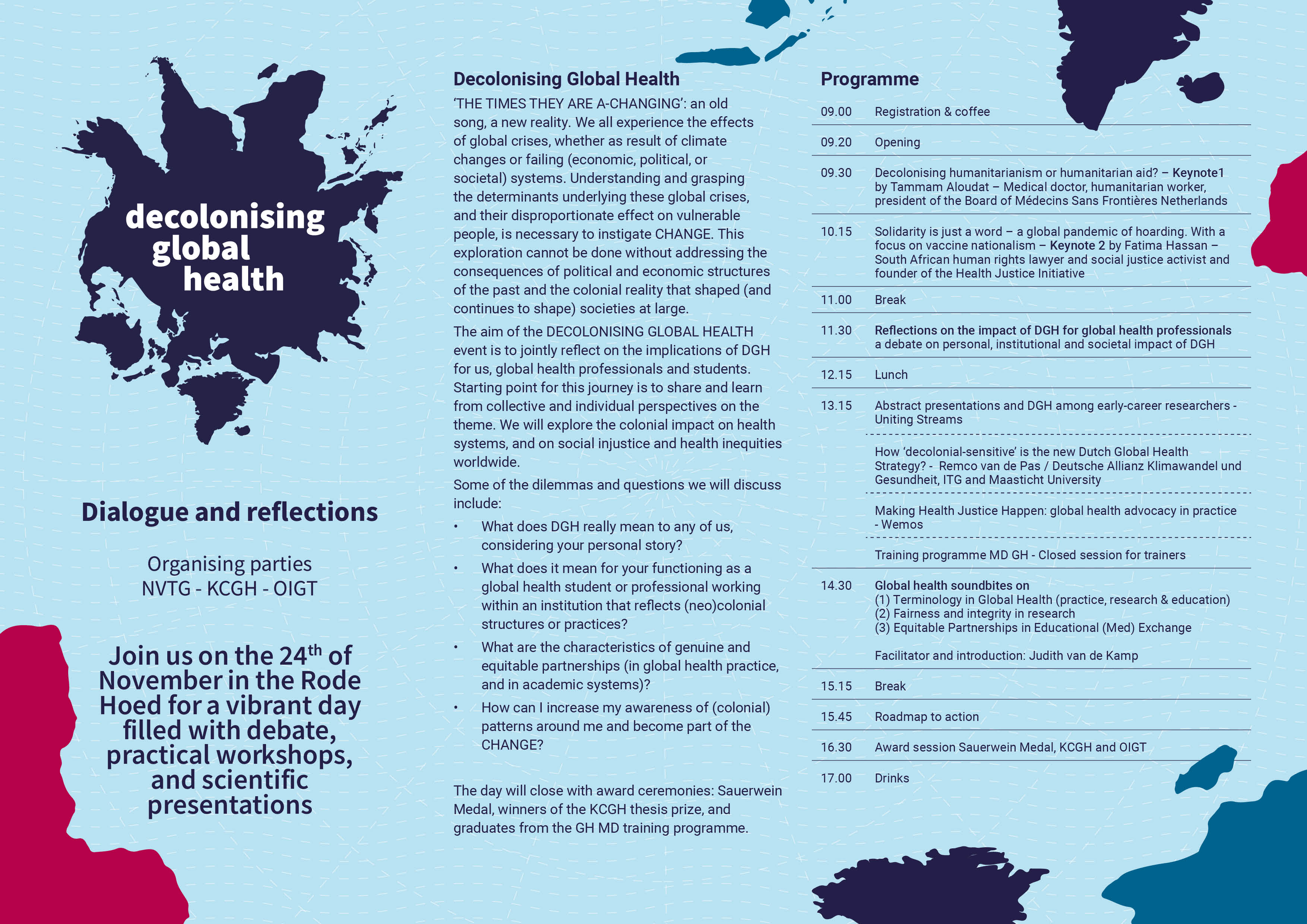 The aim of the DECOLONISING GLOBAL HEALTH event was to jointly reflect on the implications of DGH for us, global health professionals and students. Starting point for this journey is to share and learn from collective and individual perspectives on the theme. We explored the colonial impact on health systems, and on social injustice and health inequities worldwide.